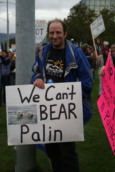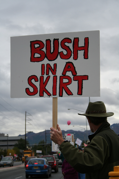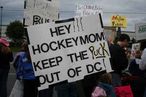 [The] Alaska Women Reject Palin rally was to be held outside on the lawn in front of the Loussac Library in midtown Anchorage. Homemade signs were encouraged, and the idea was to make a statement that Sarah Palin does not speak for all Alaska women, or men. I had no idea what to expect. The rally was organized by a small group of women, talking over coffee. It made me wonder what other things have started with small groups of women talking over coffee. It’s probably an impressive list.