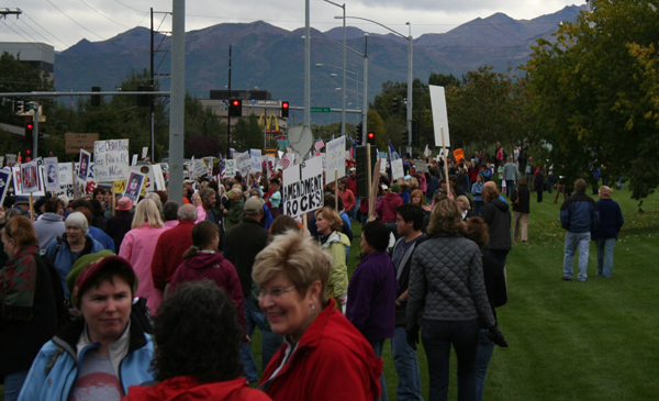 I felt a bit apprehensive. I’d been disappointed before by the turnout at other rallies. Basically, in Anchorage, if you can get 25 people to show up at an event, it’s a success. So, I thought to myself, if we can actually get 100 people there that aren’t sent by Eddie Burke, we’ll be doing good. A real statement will have been made. I confess, I still had a mental image of 15 demonstrators surrounded by hundreds of menacing “socialist baby-killing maggot” haters.